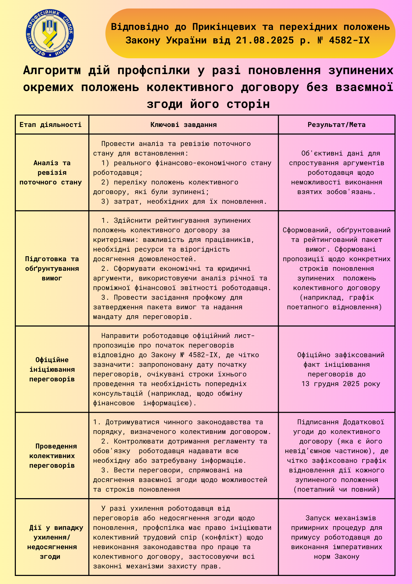 Отже, з 13.09.2025 відповідно до Закону №4582, роботодавець і далі може ініціювати зупинення дії окремих положень колективного договору, але дія таких положень може бути зупинена тільки за взаємною згодою сторін договору.