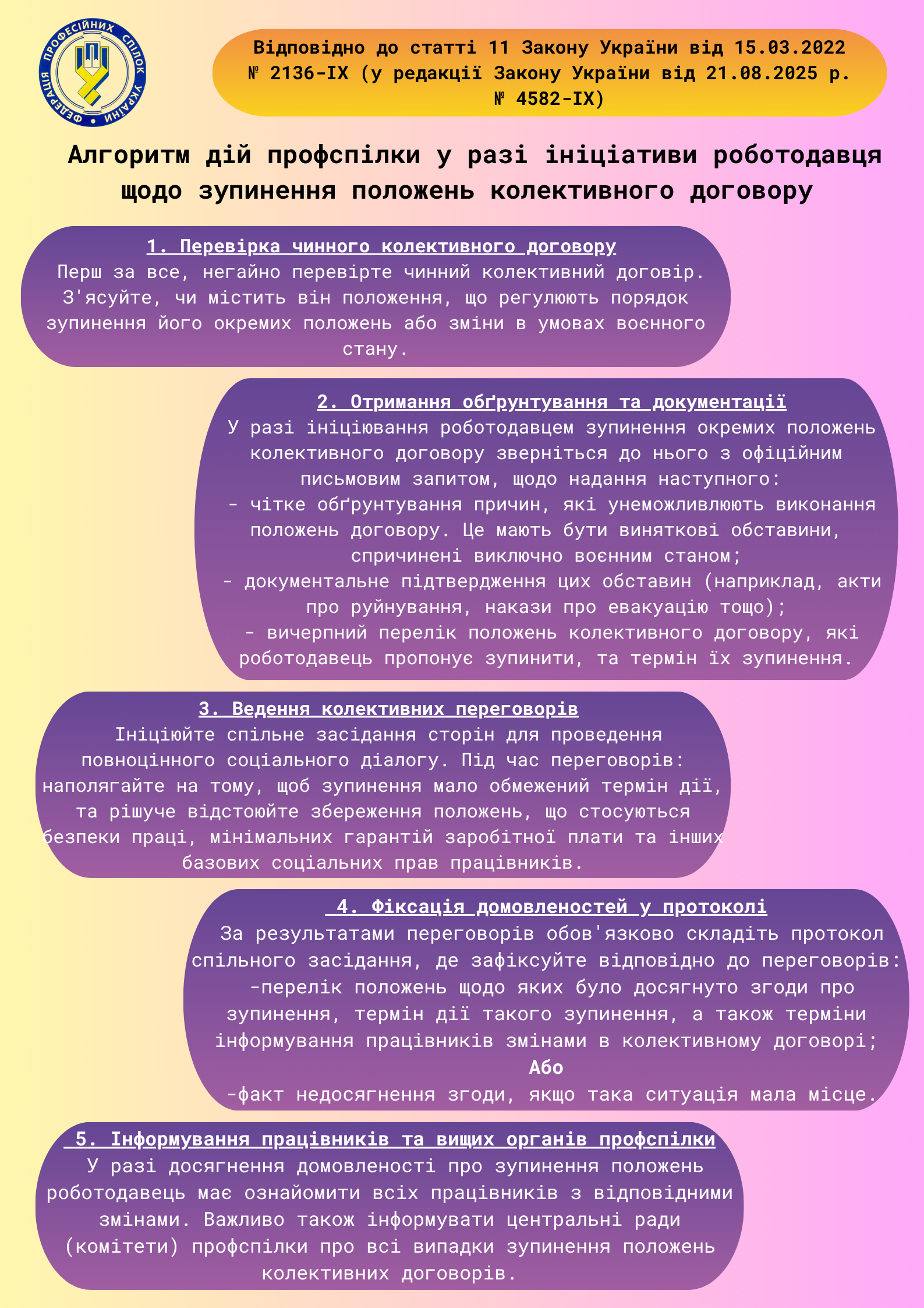 За участю сторін соціального діалогу та наполегливу позицію Профспілок щодо покращення захисту трудових прав працівників, з метою вдосконалення порядку зупинення дії окремих положень колективних договорів під час воєнного стану, суб'єктами законодавчої ініціативи було зареєстровано у Верховній Раді проєкт Закону України «Про внесення змін до статті 11 Закону України «Про організацію трудових відносин в умовах воєнного стану» (реєстр. № 13388 від 19.06.2025).